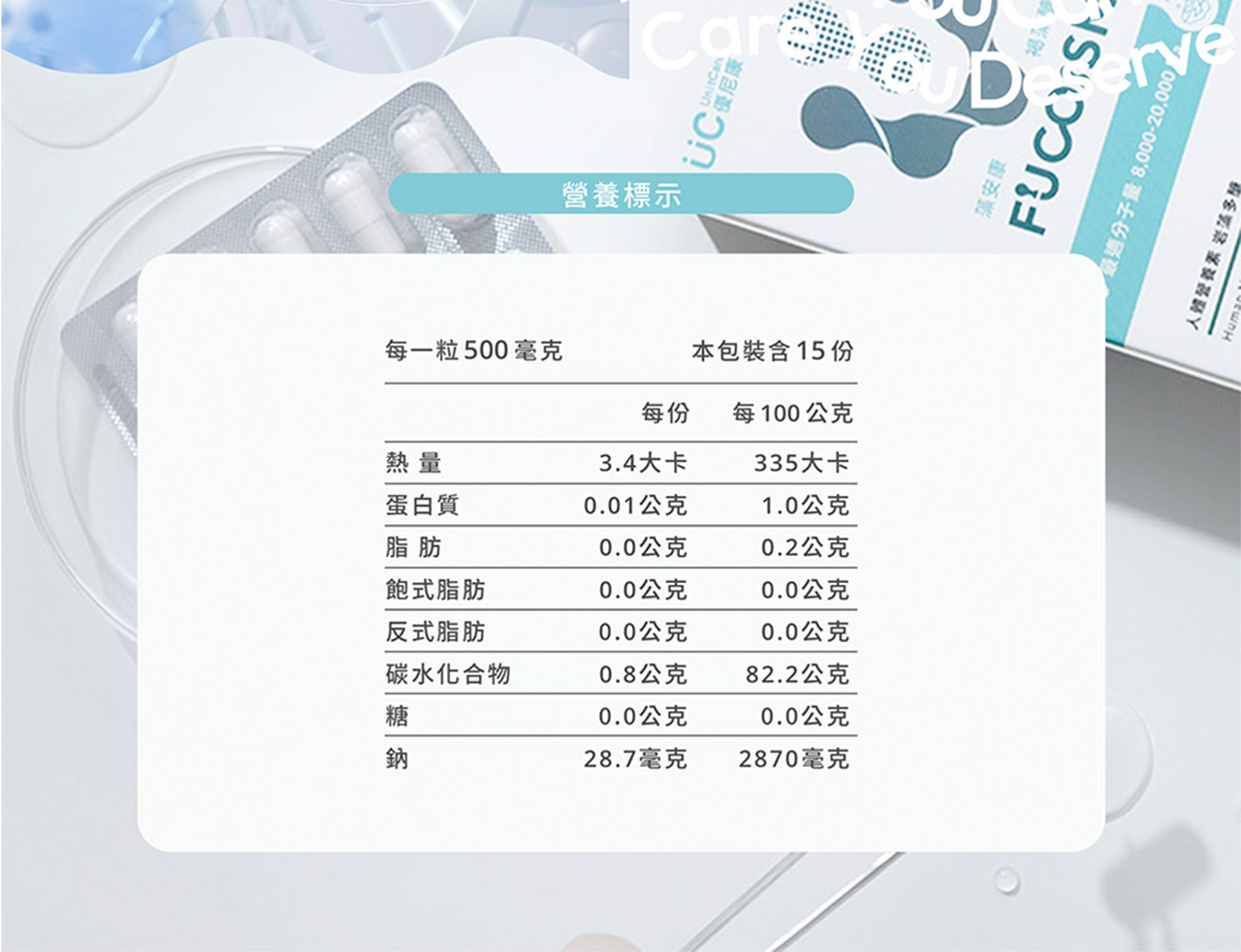 商品成份:褐藻糖膠-純度85%,250 mg Fucoidan (褐藻萃取物-含岩藻聚糖硫酸酯)木寡糖-純度95%,250 mg xylo-oligosaccharide (木寡糖95P)