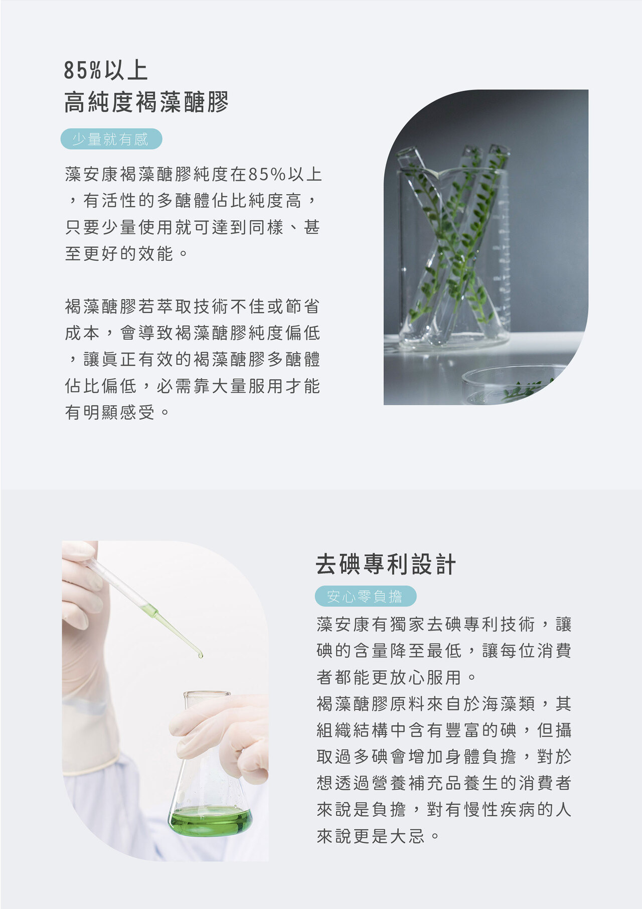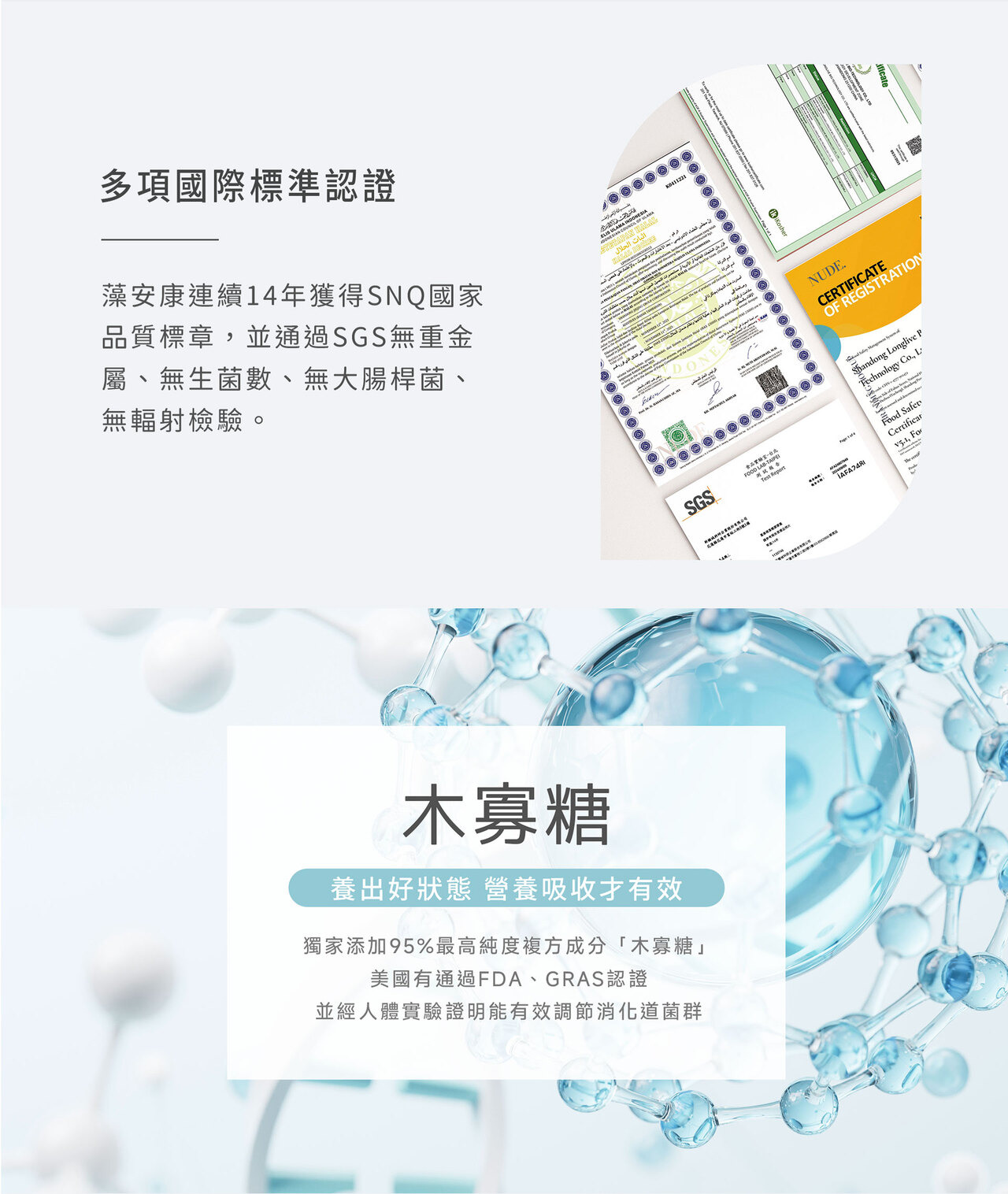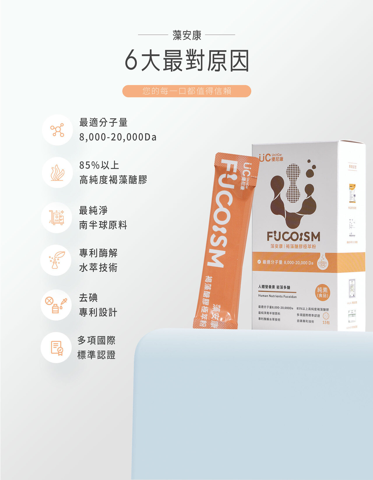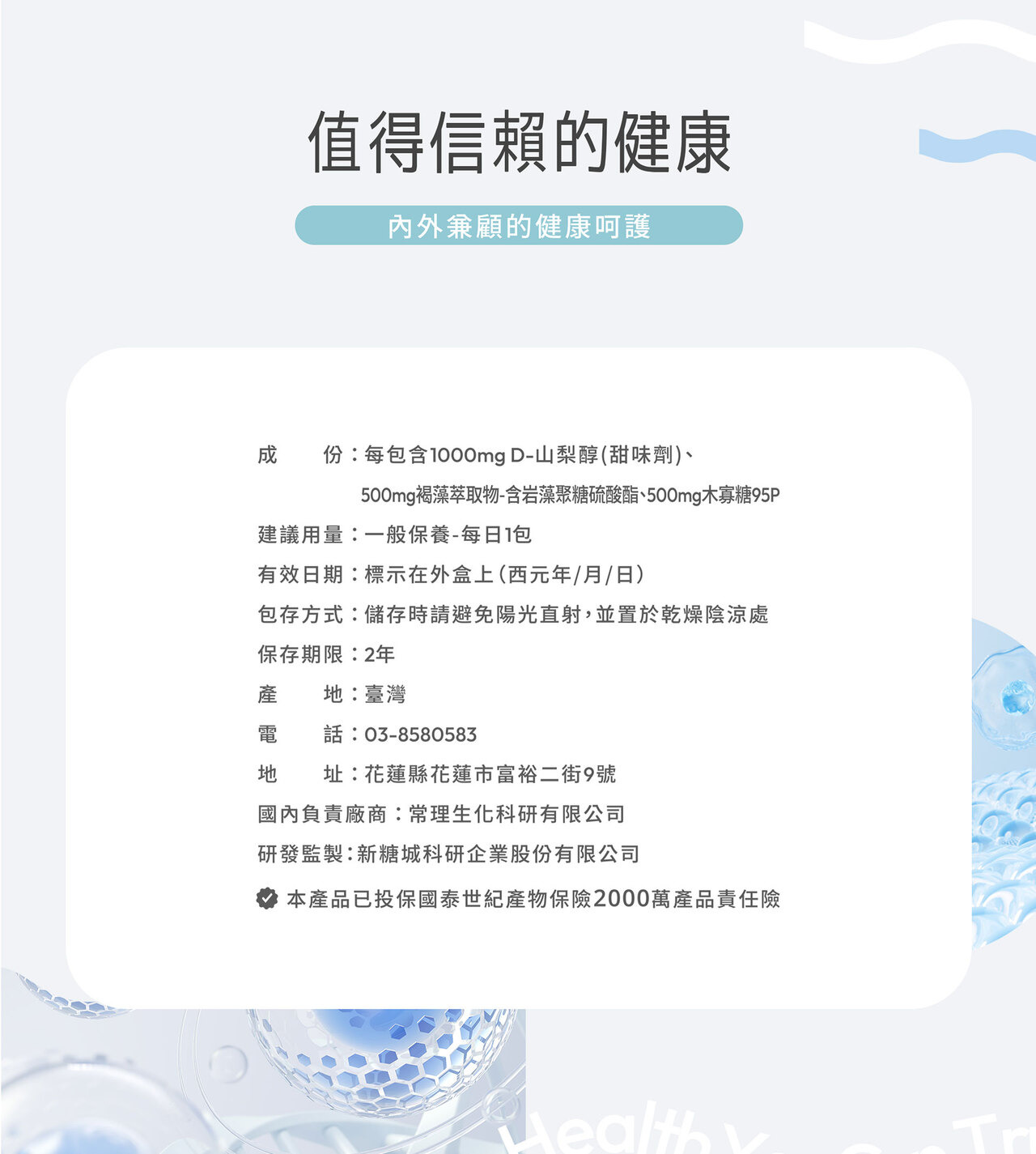 注意事項:褐藻糖膠、木寡糖、D-山梨醇(甜味劑)均無與其他食品或藥品之配合禁忌,也沒有食用時間限制