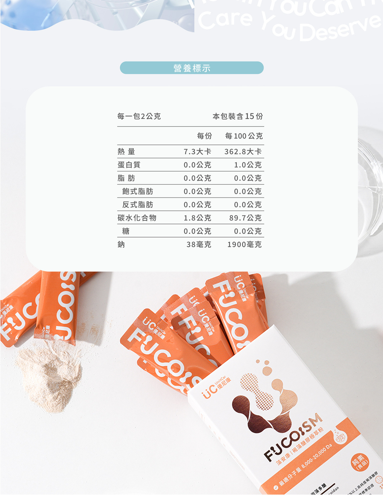 商品規格:2公克/包,每盒15包(每包含500mg高純度褐藻糖膠)